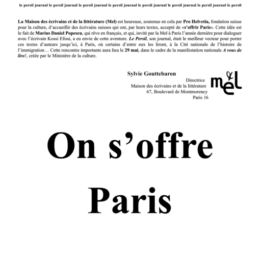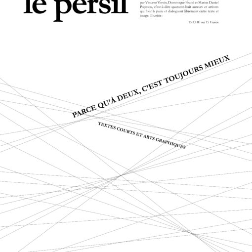 Journal inédit, cette fois-ci avec des textes de plusieurs auteurs, le persil est à la fois parole et silence; ce numéro spécial est simple et coûte FRS 5.- ou 4.- Euros.