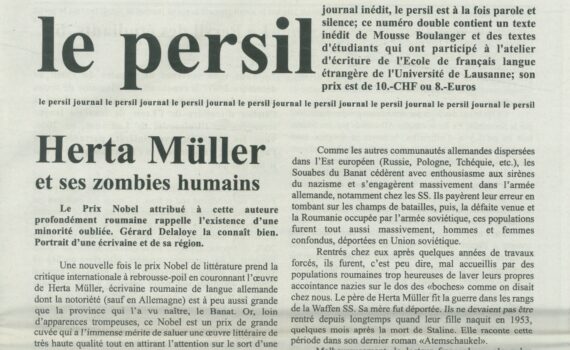 Journal inédit, le persil est à la fois parole et silence; ce numéro double est dédié à l’écrivain Hugo Loetscher; cet exemplaire coûte 10.- CHF ou 7.- Euros. Eté 2010, 24 pages. Contributions de : Hugo Loetscher, Moritz Leuenberger, Jean-Louis Kuffer, Isabelle Rüf, Etienne Barilier, Mousse Boulanger, Jeroen Dewulf, René […]