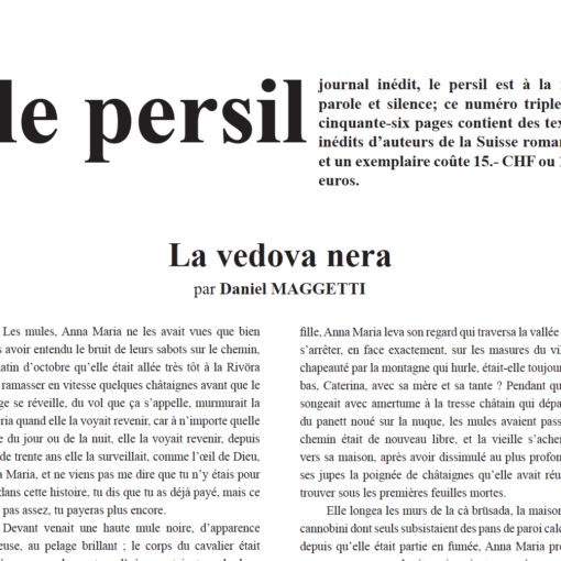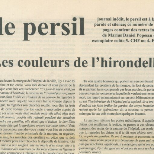 Journal inédit, le persil est à la fois parole et silence; ce numéro double contient des textes de trente-neuf auteurs suisses qui ont abordé, chacun à sa manières, l’expression « On s’offre Paris »; cet exemplaire coûte 10 CHF.