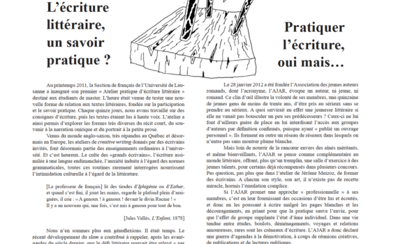 Journal inédit, le persil est à la fois parole et silence. Ce numéro double contient des textes produits en atelier par des étudiants de l’Université de Lausanne, des contributions de l’Association des jeunes auteurs romands (AJAR) et des dessins de Bruno Schaub. Il coûte 10.- CHF ou 7.- Euros. Juillet […]
