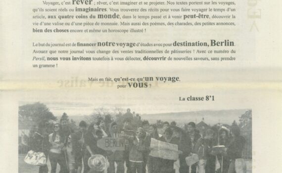 Journal inédit, le persil est à la fois parole et silence. Ce numéro spécial, hors série, a été entièrement réalisé par la classe 8’1 VSB de Prilly. Sa vente doit financer le voyage d’études de la classe à Berlin. Il coûte 10.- CHF. Novembre 2012, 28 pages. Textes de Manon […]