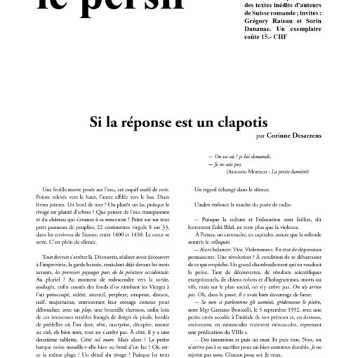 Journal inédit, le persil est à la fois parole et silence. Ce numéro simple, réalisé par Louis-Philippe Ruffy, contient les textes et les réflexions de dix écrivains de Suisse romande et de France, ainsi que des textes inédits de Marius Daniel Popescu. Il coûte 5.- CHF ou 4.- Euros.