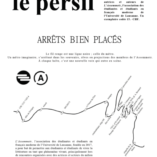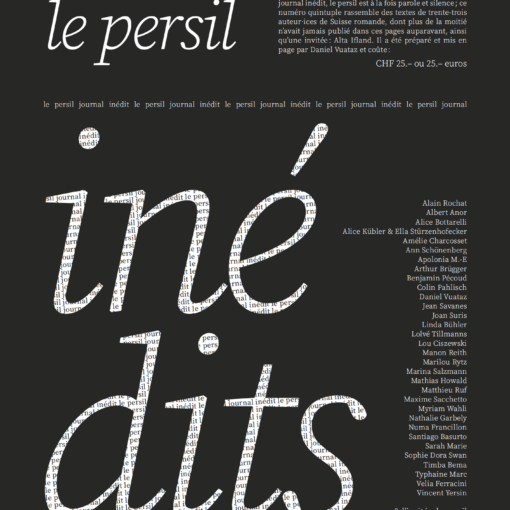 Journal inédit, le persil est à la fois parole et silence. Ce numéro triple contient des textes de vingt-huit membres de l’Association des écrivains neuchâtelois et jurassiens (AENJ) et des dessins de Gilbert Pingeon et Claudine Houriet. Il coûte 15.- CHF ou 12.- Euros.