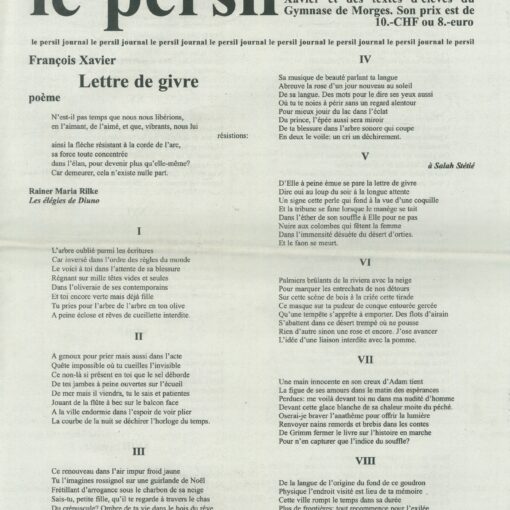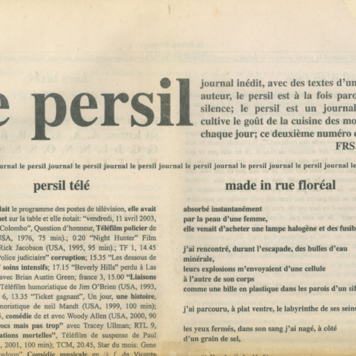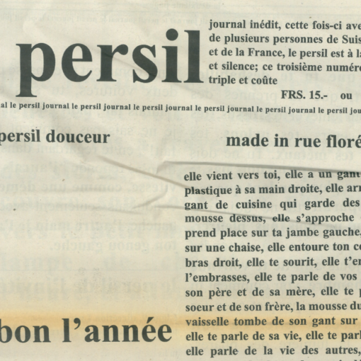 Journal inédit, le persil est à la fois parole et silence; ce numéro triple de quarante-huit pages contient des textes inédits d’auteurs de la Suisse romande et un exemplaire coûte 15.- CHF ou 12.- Euros.