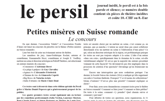 Journal inédit, le persil est à la fois parole et silence; ce numéro double contient six pièces de théâtre inédites et coûte 10.- CHF ou 8.- Euros. Janvier 2014, 28 pages. Textes pour le théâtre écrits dans le cadre d’un concours organisé par l’association Tulalu ?! : Adrienne Bovet, Guy Chevalley, […]