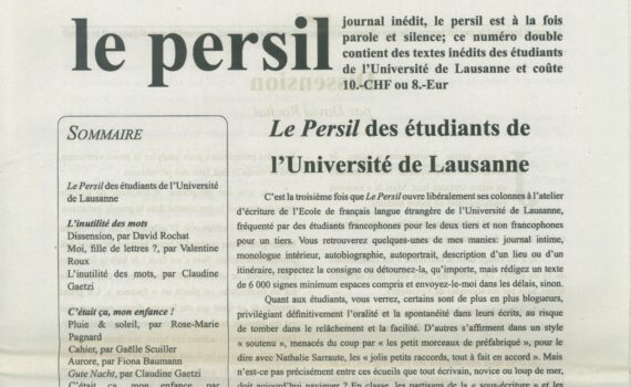 Journal inédit, le persil est à la fois parole et silence; ce numéro double contient des textes inédits des étudiants de l’Université de Lausanne et coûte 10.- CHF ou 8.- Euros. Mars 2014, 36 pages. Introduction d’Anne-Lise Delacrétaz.Textes de David Rochat, Valentine Roux, Claudine Gaetzi, Rose-Marie Pagnard, Gaëlle Scuiller, Fiona […]