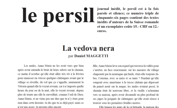 Journal inédit, le persil est à la fois parole et silence; ce numéro triple de cinquante-six pages contient des textes inédits d’auteurs de la Suisse romande et un exemplaire coûte 15.- CHF ou 12.- Euros. Juillet 2014, 56 pages. Avec les contributions de : Daniel Maggetti, Claire Genoux, Alain Rochat, […]