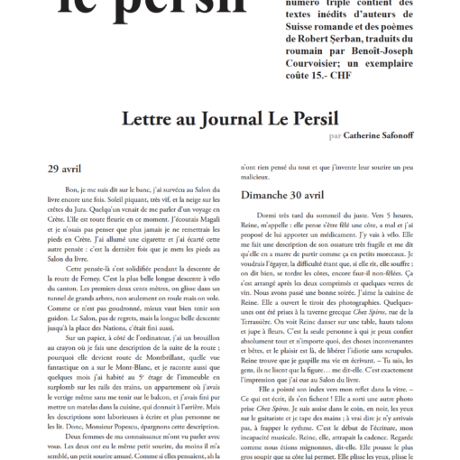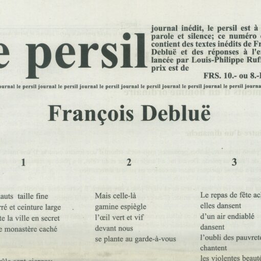 Journal inédit, le persil est à la fois parole et silence; ce numéro double contient des textes inédits des étudiants de l’Université de Lausanne et coûte 10.- CHF ou 8.- Euros.