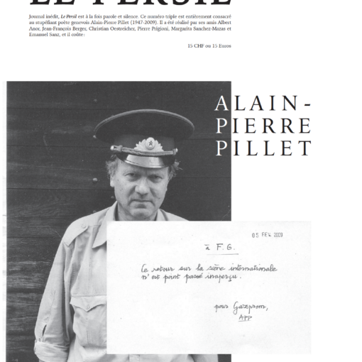 Journal inédit, le persil est à la fois parole et silence; ce numéro double contient des textes inédits d’auteurs qui ont reçu le Prix Atelier d’écriture Studer/Ganz; un exemplaire coûte 10.- CHF.