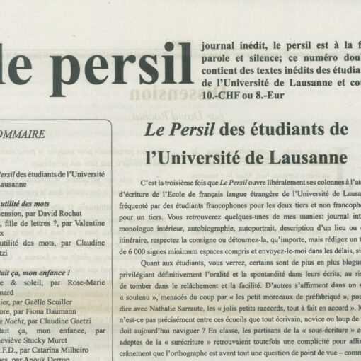 Journal inédit, le persil est à la fois parole et silence. Ce numéro triple contient vingt-quatre binômes réunis par Vincent Yersin, Dominique Brand et Marius Daniel Popescu, c’est-à-dire quarante-huit auteurs et artistes qui font la paire et dialoguent librement entre texte et image. Il coûte 15.- CHF ou 15 Euros.