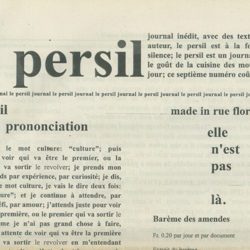 Journal inédit, le persil est à la fois parole et silence. Ce numéro triple contient des textes de quinze auteurs de Suisse, de Belgique et du Québec, invités à écrire autour de la notion d’abri. Il a été réalisé par Anne-Sophie Subilia et Guy Chevalley et coûte 15.- CHF ou 15 Euros.