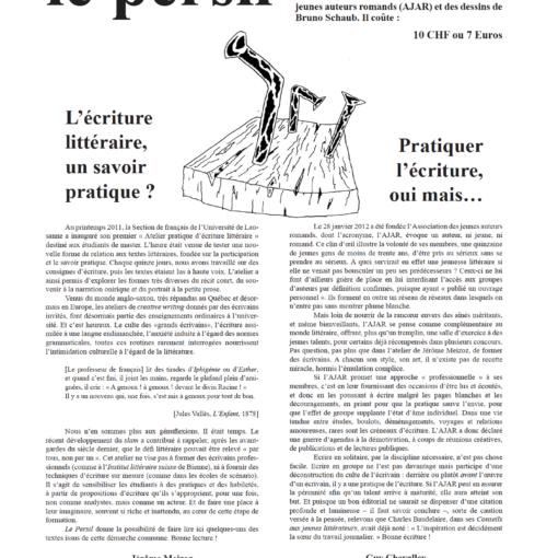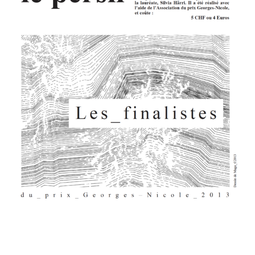 Journal inédit, Le Persil est à la fois parole et silence. Ce numéro quadruple contient de la poésie sous toutes ses formes, inédite et écrite par soixante-huit auteur-es de Suisse romande réuni-es à l’occasion du Printemps de la Poésie. Il coûte : 20.- CHF ou 20 Euros.
