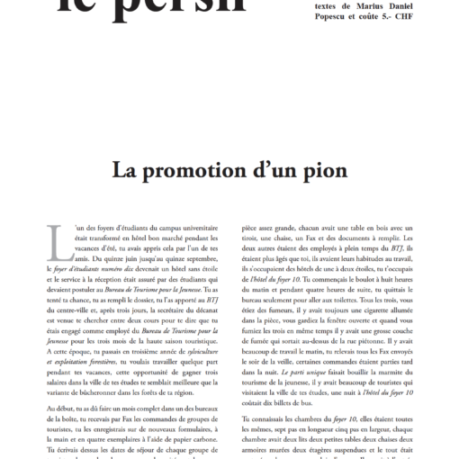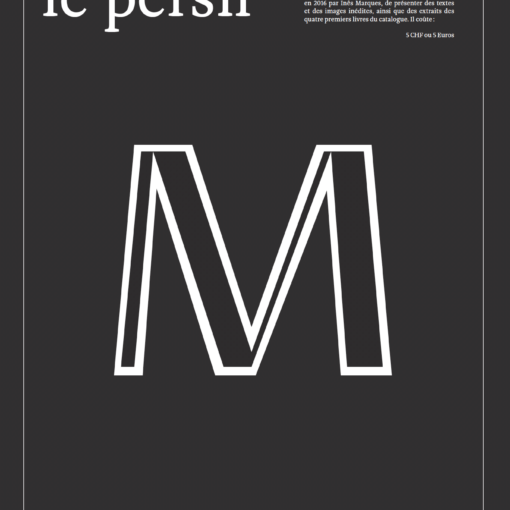 Journal inédit, le persil est à la fois parole et silence. Ce numéro double sous forme de carte blanche thématique contient des textes de jeunes autrices et auteurs de L’Assommoir, l’association des étudiantes et étudiants en français moderne de l’Université de Lausanne. Un exemplaire coûte 10.- CHF.