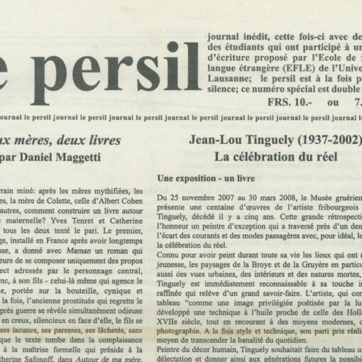 Journal inédit, le persil est à la fois parole et silence. Ce numéro quadruple sous forme de carte blanche thématique contient des textes de jeunes autrices et auteurs de l’Assommoir, l’association des étudiantes et étudiants en français moderne de l’Université de Lausanne. Un exemplaire coûte 20. CHF.