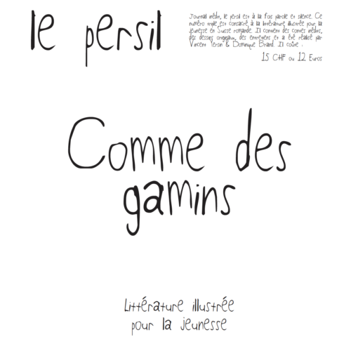 Journal inédit, le persil est à la fois parole et silence. Ce numéro double contient des textes écrits en collectif par 70 étudiant·es du Collège pour adultes Alice-Rivaz à Genève (COPAD), durant un atelier avec Daniel Vuataz. Les dessins ont été réalisés par 15 élèves de l’École supérieure de bande dessinée et d’illustration de Genève (ESBDI). Il coûte 15.- CHF.