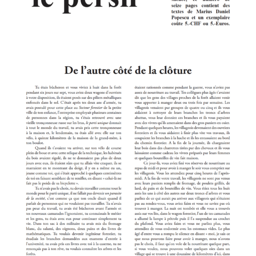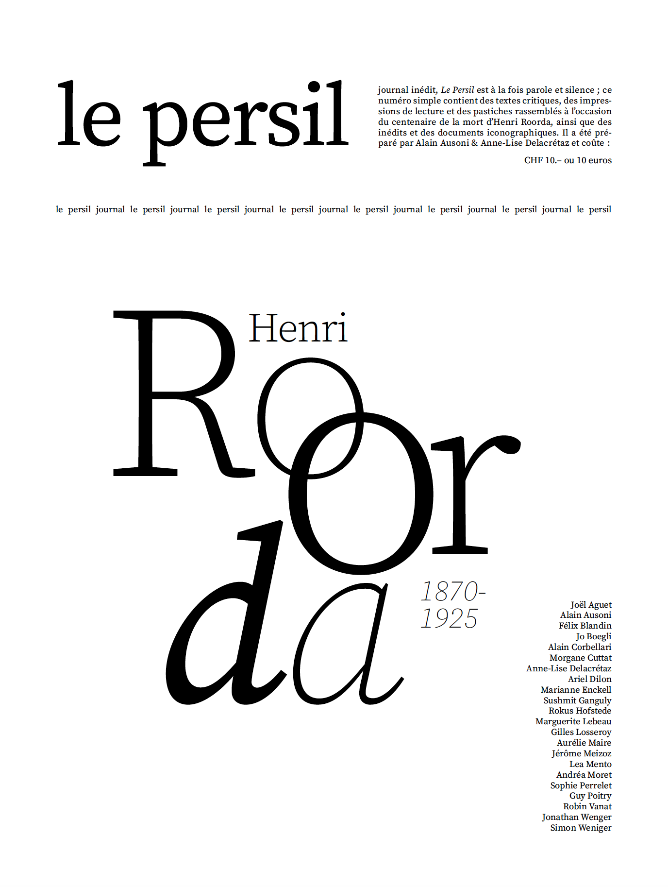 Journal inédit, le persil est à la fois parole et silence ; ce numéro simple contient des textes critiques, des impressions de lecture et des pastiches rassemblés à l’occasion du centenaire de la mort d’Henri Roorda, ainsi que des inédits et des documents iconographiques. Il a été préparé par Alain Ausoni & Anne-Lise Delacrétaz et coûte : 10 francs ou 10 euros.