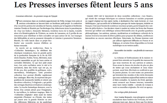 La maison d’édition des Presses Inverses, spécialisée dans les littératures qui jouent sur l’imaginaire et une bonne dose de malice, célèbre ses 5 premières années d’existence. Depuis un petit bureau de Prilly, elle fait naître chaque année une dizaine de livres charmants, troublants, enivrants… Et souhaite vous inviter aujourd’hui à célébrer […]