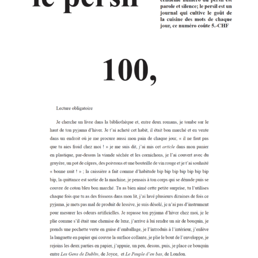 Journal inédit, le persil est à la fois parole et silence. Ce numéro contient les textes lauréats du concours « Ramuz » organisé dans les Gymnases vaudois, ainsi que les témoignanges de quatorze jeunes auteurs. Il coûte 5.- CHF ou 5.- Euros.