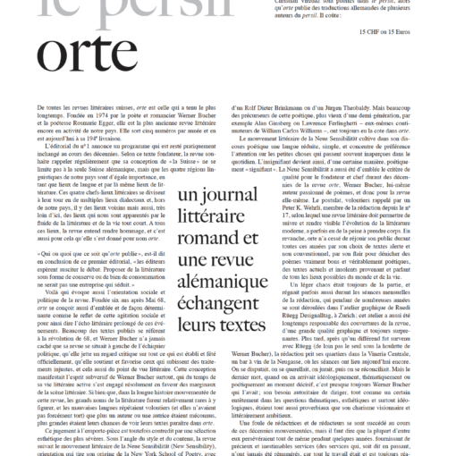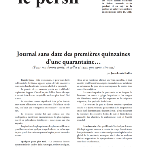 Journal inédit, cette fois-ci avec des textes d’un seul auteur, ce centième numéro du persil est parole et silence; le persil est un journal qui cultive le goût de la cuisine des mots de chaque jour, ce numéro coûte 5.- CHF.