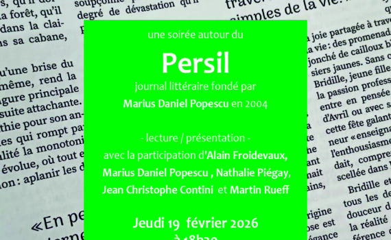 Journal inédit, le persil est à la fois parole et silence; ce numéro double contient des textes inédits de Marius Daniel Popescu et le premier numéro du persil, édité en août 2004; un exemplaire coûte 10.- CHF. Juillet 2024, 32 pages. Avec le soutien des Amis du journal le persil.